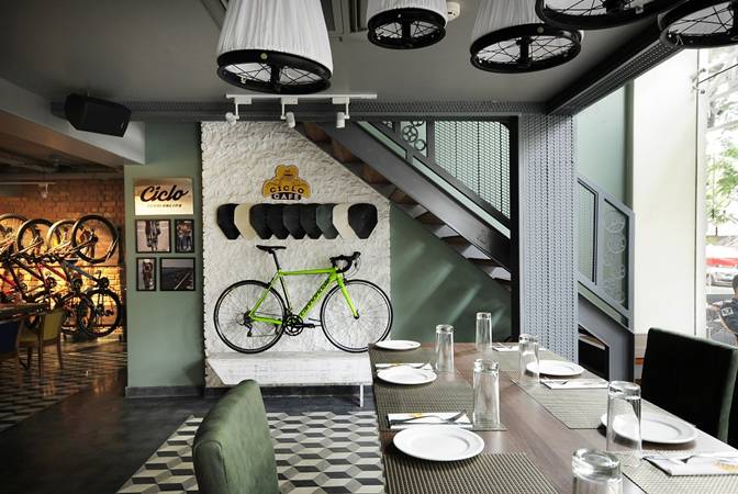 Ciclo merges the concept of cycling with a delightful café ambience which stands out with its quirky, cycling-inspired furniture. It is a well-lit space with comfortable long-table settings for families, an open seating area for large groups and a delightful use of bicycle components built into the decor. The carefully crafted menu is designed to cater to the metropolitan crowd of Bengaluru with interesting twists to local favourites from around the country including dishes like Telangana mutton, Bombay Vada pav, Grilled kasundi black pomfret to name a few.
